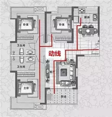 ??動(dòng)線就是指人們活動(dòng)的路線,它根據(jù)人的行為方式把一定的空間組織起來。換句話說,就是人在室內(nèi)室外的移動(dòng)點(diǎn),聯(lián)合起來就成為了動(dòng)線。動(dòng)線設(shè)計(jì)一般由兩部分構(gòu)成,一是固定物件的擺設(shè),二是人流、物流的路徑。戶型動(dòng)線一般分為三類:家人動(dòng)線、家務(wù)動(dòng)線和訪客動(dòng)線。三種動(dòng)線在涉及區(qū)域和設(shè)計(jì)要點(diǎn)方面都有所不同。