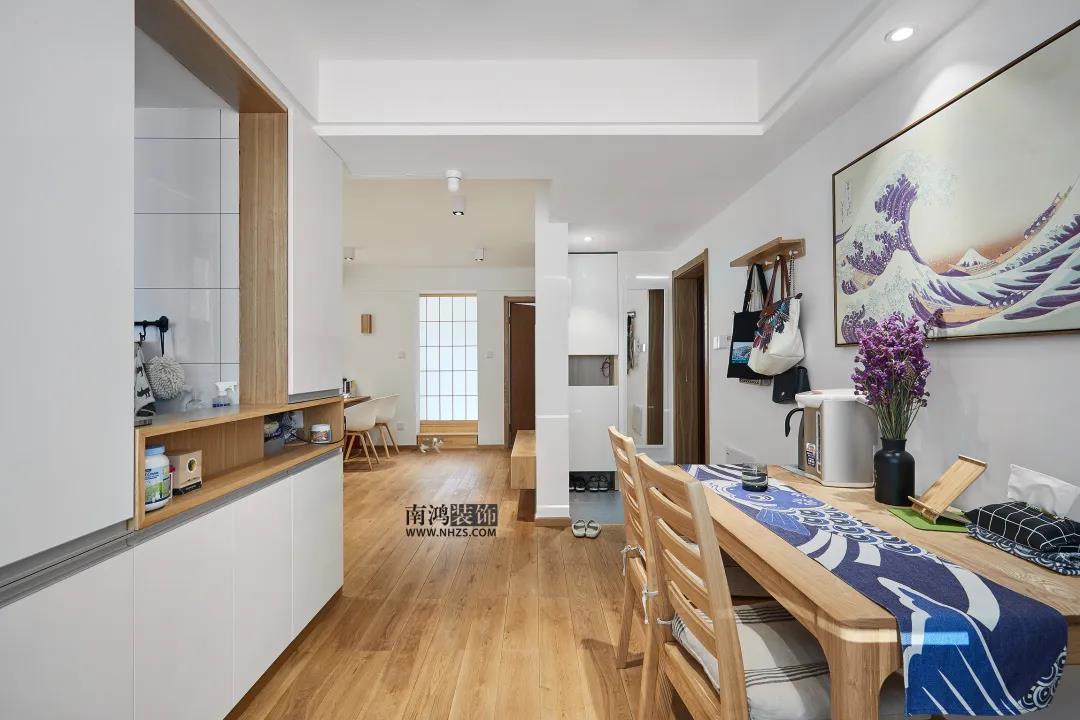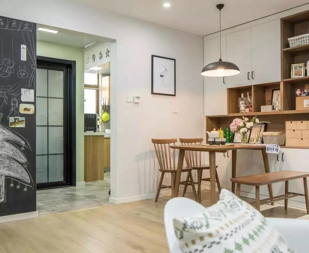 以白色背景為主,搭配木質家具的日式風餐廳,通過原木風的餐桌椅和木白結合的餐邊柜,來展現日系的治愈基調。