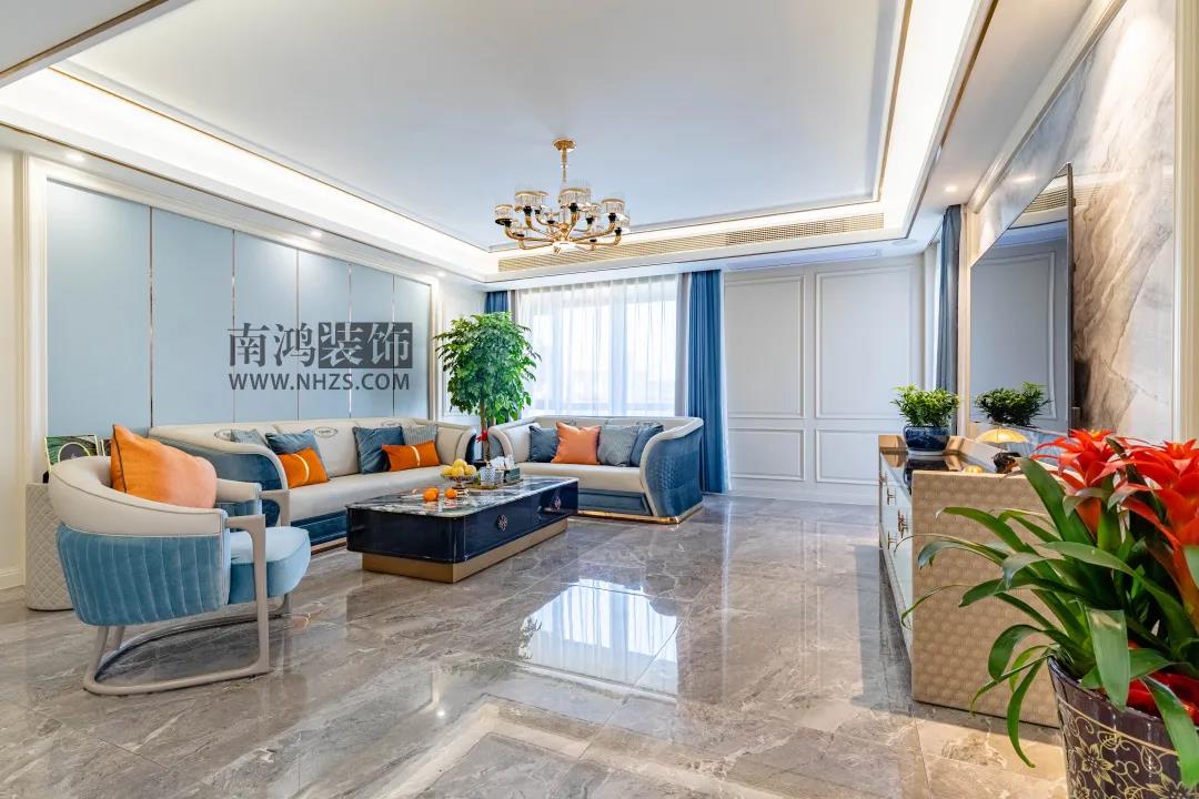 戶 型 圖 設計說明: 1、進門處拆除左墻,使父親房和客衛干區面積增大,并改變客衛進門位置,使得餐廳更加完整; 2、過道上的走入式衣帽間改成了兩個背靠背的柜子,不僅使房間增大,還多了一個書柜的空間; 3、母親房原本的房門直對過道,后更改了位置; 4、主臥改了衣帽間的朝向和主衛的墻,在保證空間的情況下滿足了業主儲物需求。 客 廳 客廳的地面選用深灰色拋釉磚,大理石材質的電視背景墻與之呼應。大面積藍色系的運用,使客廳空間透出清爽自然的氣息,背景墻、吊頂和家具中都加入了金色元素,透出優雅輕奢的味道。 沙發結合了皮革、布藝和絨面,溫暖舒適。桔色的抱枕作為跳色,為這方空間注入了活力和趣味,角落里的大盆綠植增添生氣。 客廳望向玄關視角。通透的空間感與視覺感令人無比舒適~ 餐 廳 餐廳延續了客廳的硬裝風格,與客廳之間毫無阻礙,動線流暢,開敞的空間還能帶給居住者更多有關美食的想象。 餐廳背景僅用一幅簡約藝術畫裝飾,兩側設計入墻式餐邊柜,實用且大方,并利用后陽臺的位置開辟了一個休閑吧臺的空間。 明黃的花色在這個純凈的視界中散發出鮮明而絢麗的審美意涵,讓屋主在芳香中品嘗人生百味~ 主 臥 主臥背景墻風格與客廳相似,又借暖色的床品顯現出空間個性,淺色木地板顯得溫潤而舒適。房間中還專門擺放了床尾凳,從細節上進一步提升空間品質。 兒 童 房 兒童房背景墻選用淺藍色墻漆裝飾,搭配多彩的窗簾和純白的高背床,簡約中勾勒出活力色彩。 兒童房進門一側多放了一個書柜,結合另一側的學習區,充分滿足孩子讀書時的日常需求。 衛 生 間 次衛一,做了干濕分離,暖灰色的墻磚與地磚呼應,視感舒服,高級灰的浴室柜挑空設計并點綴上金屬細節,時尚而前衛。 次衛二,采光充足,光線明亮,深藍的衛浴柜搭配金色拉手,顏值滿分。 | 地址:水景城豪苑 | 面積:250㎡ | 風格:輕奢 | 設計施工:浙江南鴻裝飾