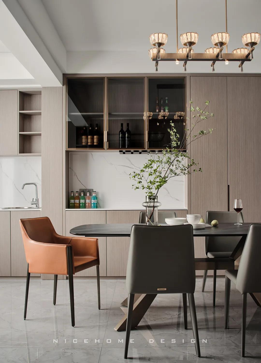 【項(xiàng)目·信息】 地址 / 銀億東岸 戶型 / 四室兩廳 面積 / 200㎡ 風(fēng)格 / 現(xiàn)代簡(jiǎn)約 設(shè)計(jì)施工 / 浙江南鴻裝飾 1 關(guān)于作品 本案以現(xiàn)代簡(jiǎn)約為主題,簡(jiǎn)潔明快的設(shè)計(jì)風(fēng)格為主調(diào),著力體現(xiàn)家的精致與個(gè)性,符合現(xiàn)代人的生活品味。 公共區(qū)域整體采用暖咖和黑、白色調(diào),溫和親切又帶著現(xiàn)代感的利落灑脫,木格柵增強(qiáng)視覺效果,軟裝上則重點(diǎn)用橙色點(diǎn)綴,烘托溫馨氣氛與活力感受。 2 戶型圖 3 設(shè)計(jì)落地 玄關(guān) ENTRANCE 玄關(guān)端景處一幅格外醒目的復(fù)刻畫,大色塊的紅彰顯熱烈、前衛(wèi),寓意主人對(duì)新生活的愛和熱忱,從今往后,要把每一天都過得“熱氣騰騰”! 客廳 LIVING ROOM 客廳,暖咖色伴隨著溫柔的觀感,讓時(shí)光也仿佛靜止于此。沒有特別多收納設(shè)計(jì),這里的一切布置均以“美”為第一要義。 電視背景墻的設(shè)計(jì),低調(diào)中透著華麗。高顏值的大理石磚搭配錯(cuò)落有致的木格柵,冷暖結(jié)合,細(xì)節(jié)處再點(diǎn)綴光影,簡(jiǎn)潔而富有格調(diào)。 木質(zhì)格柵,素來自帶一種東方禪意之美,虛實(shí)相生,正是架構(gòu)意境的獨(dú)到方式。木飾面板中藏起通往次臥的房門,視覺高度統(tǒng)一。沙發(fā)與茶幾選擇低矮款式,有利于縱向拉伸層高。 餐廳 DINING ROOM 一個(gè)優(yōu)秀的餐廳,光靠視覺,就能成功挑動(dòng)你的味蕾,再平凡的食物也因此裹上了一層美好滋味。 整排餐邊柜兼做酒柜,玻璃柜內(nèi)藏酒,儲(chǔ)物柜里存放食品,實(shí)用性與美觀度都是一流。窗邊做了小水吧,延續(xù)廚房的功能,餐前餐后的手部清潔也更方便。 在這里每天給孩子做一頓愛心早餐,給愛人煮一壺香醇的咖啡,幸福的感覺就這樣漸漸氤氳開來。 廚房 KITCHEN 廚房寬敞明亮,黑色櫥柜較一般櫥柜而言更能凸顯質(zhì)感,功能設(shè)備完善,在吊頂上也做足了功夫,造型感與線條感呼應(yīng)整體風(fēng)格。 過道 CORRIDOR 溫潤(rùn)的木材非常容易給人親近的感覺,無形中就消弭掉空間與居者的距離。過道一側(cè)設(shè)計(jì)儲(chǔ)物區(qū)域,層架上適合擺放書籍、小飾品等,空間瞬時(shí)生動(dòng)了起來。 臥室 BEDROOM 主臥延續(xù)公共區(qū)域的色調(diào),米灰色硬包和木飾面,讓溫暖、淡雅的味道徘徊其中。一盞暖意小吊燈垂下,增強(qiáng)空間的調(diào)性,小飄窗則賦予臥室更多的浪漫色彩,和對(duì)生活的美好想象。 次臥,皮藝、布料、金屬與線條的融合,交匯出高品質(zhì)精致感。 粉色是兒童房一直在流行的主題,許多女孩子的夢(mèng)里或許都有這樣一個(gè)如童話般的飄著粉紅泡泡的房間吧~