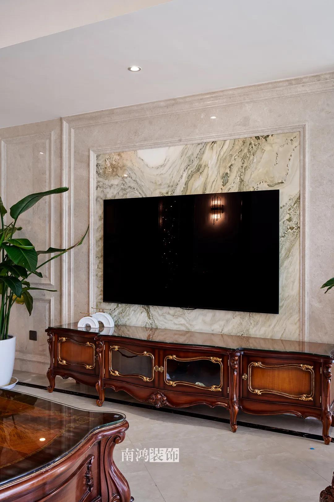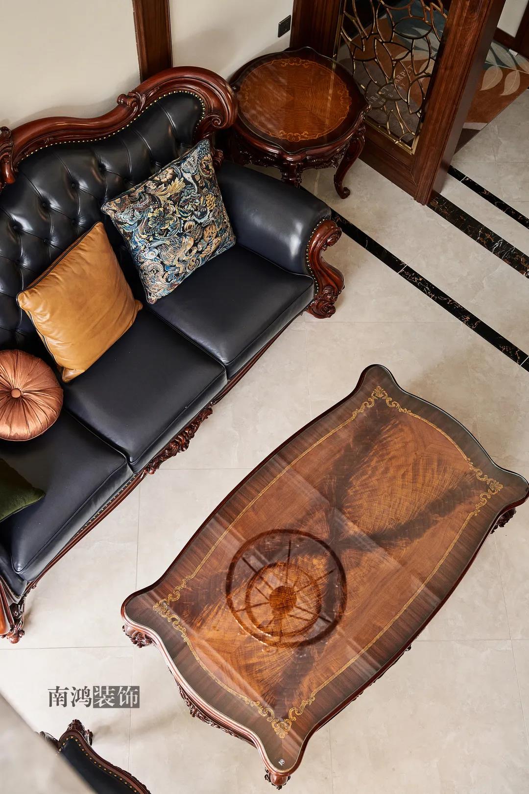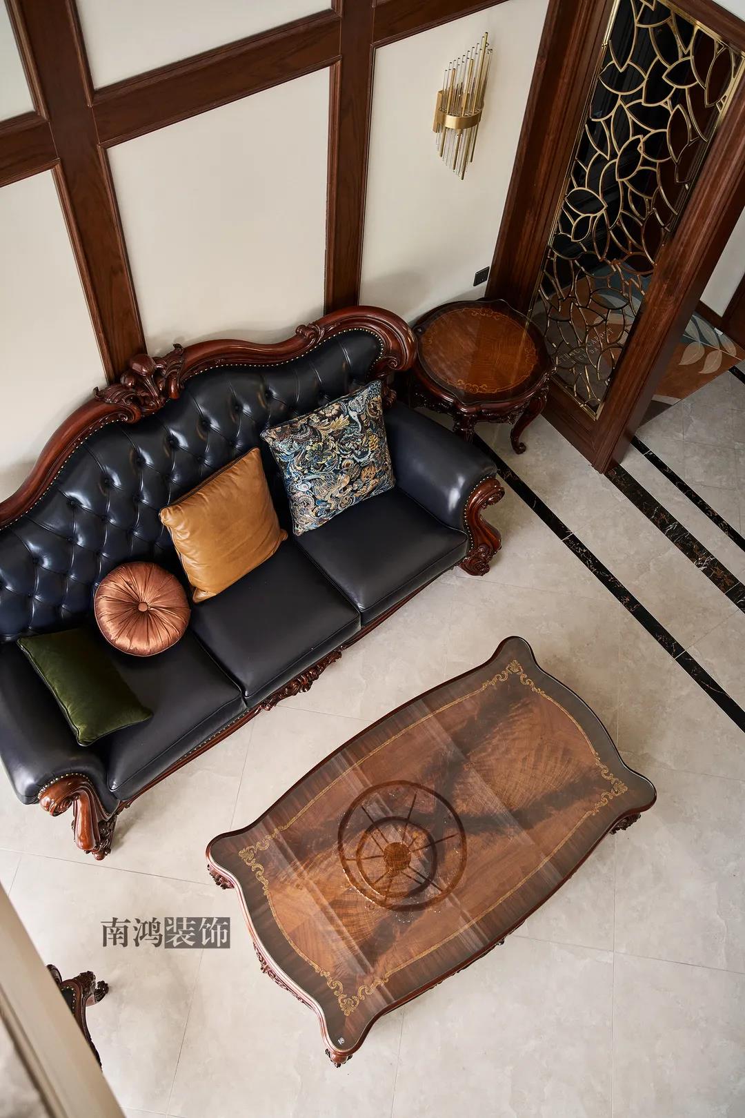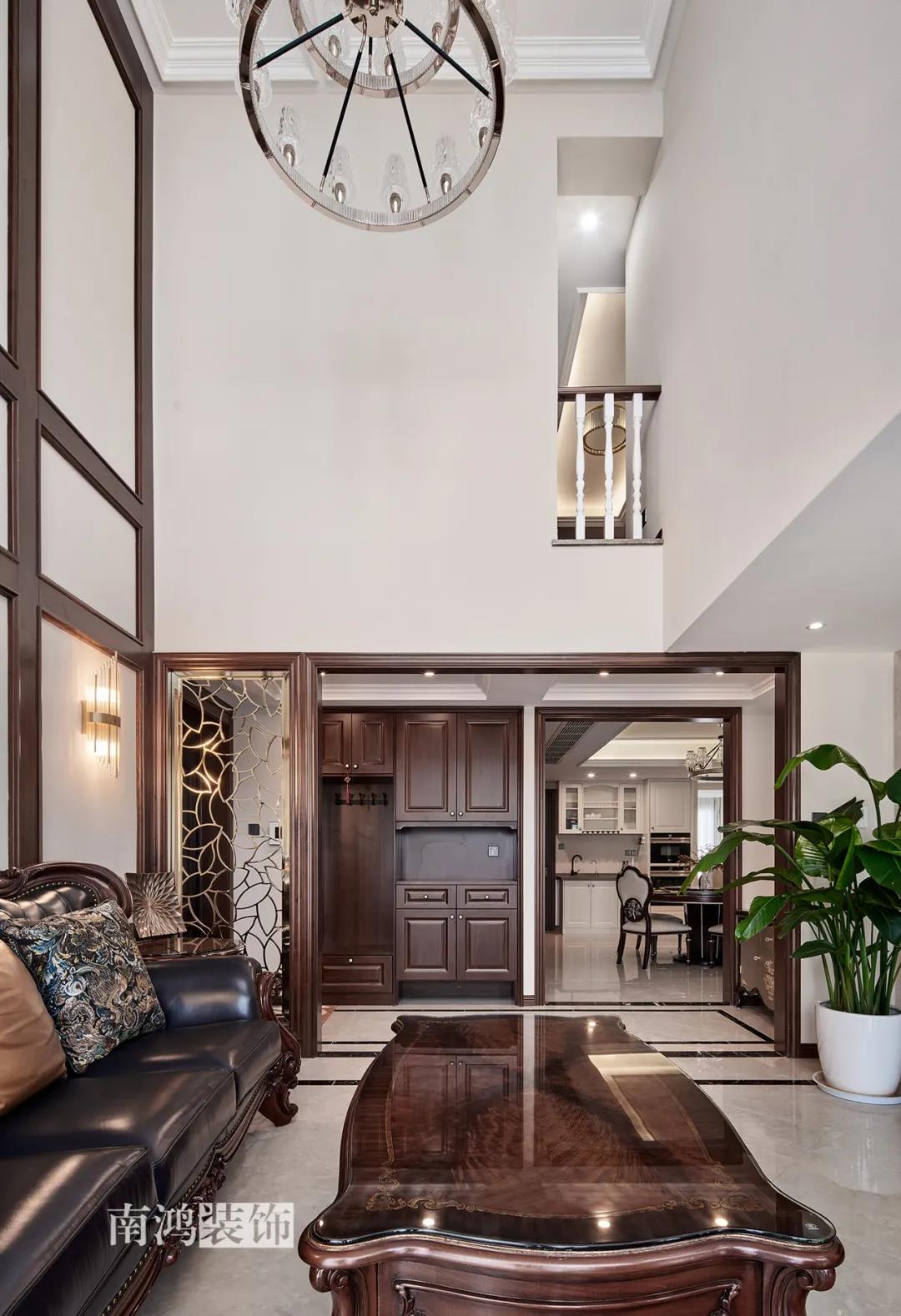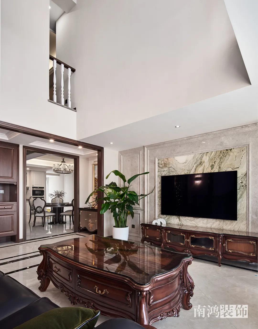 轉入客廳,挑高的空間氣勢十足。軟裝材質、色彩選擇,傳達出濃厚的歷史文化底蘊,契合業主對高檔格調的追求,同時在硬裝上簡化線條,空間更加明晰可觀。
