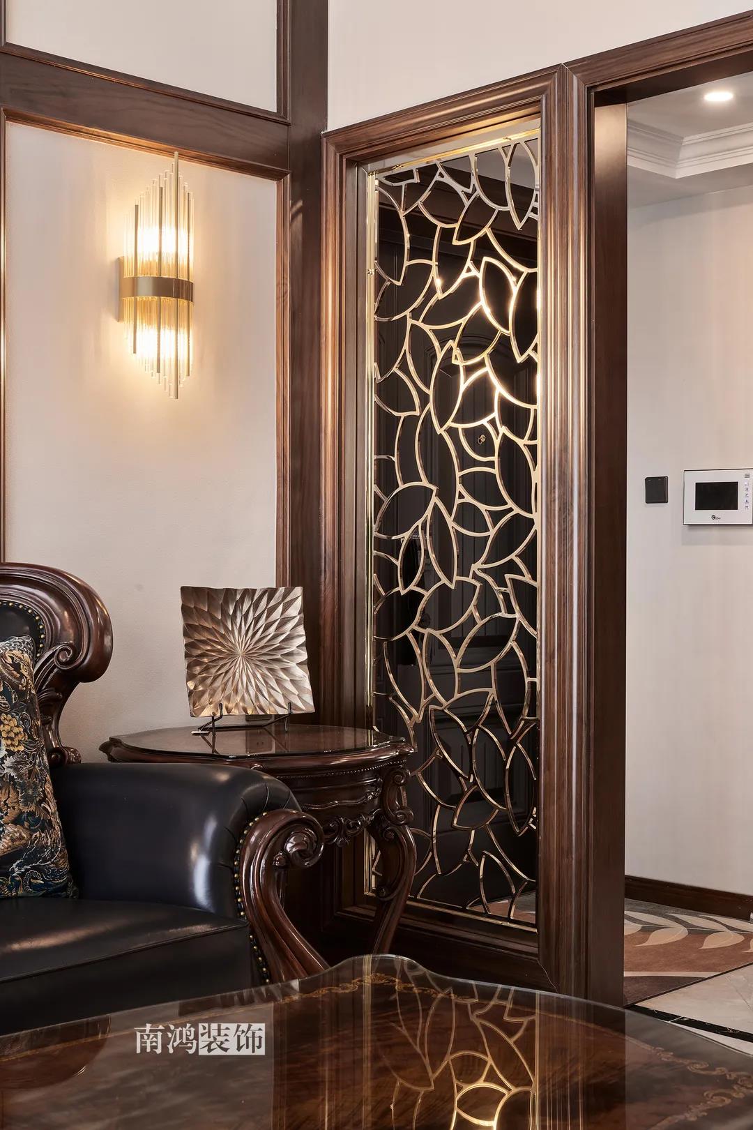 客廳是家庭活動的重心,在裝飾上力求凸顯典雅莊重的特點。華貴的深色沙發靠墻安放,金屬鏤空隔斷在壁燈的照耀下泛起光澤,光滑的茶幾表面折射著溫度,優雅利落的奢華感,從種種細節間流露出來。