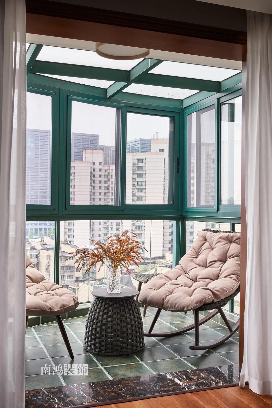 主臥的休閑區,天氣好的時候,柔和的光線透過窗子灑進陽臺,優雅的主人坐在舒適的躺椅上靜靜品茶、看書,理想中的歲月靜好似乎照進了現實。