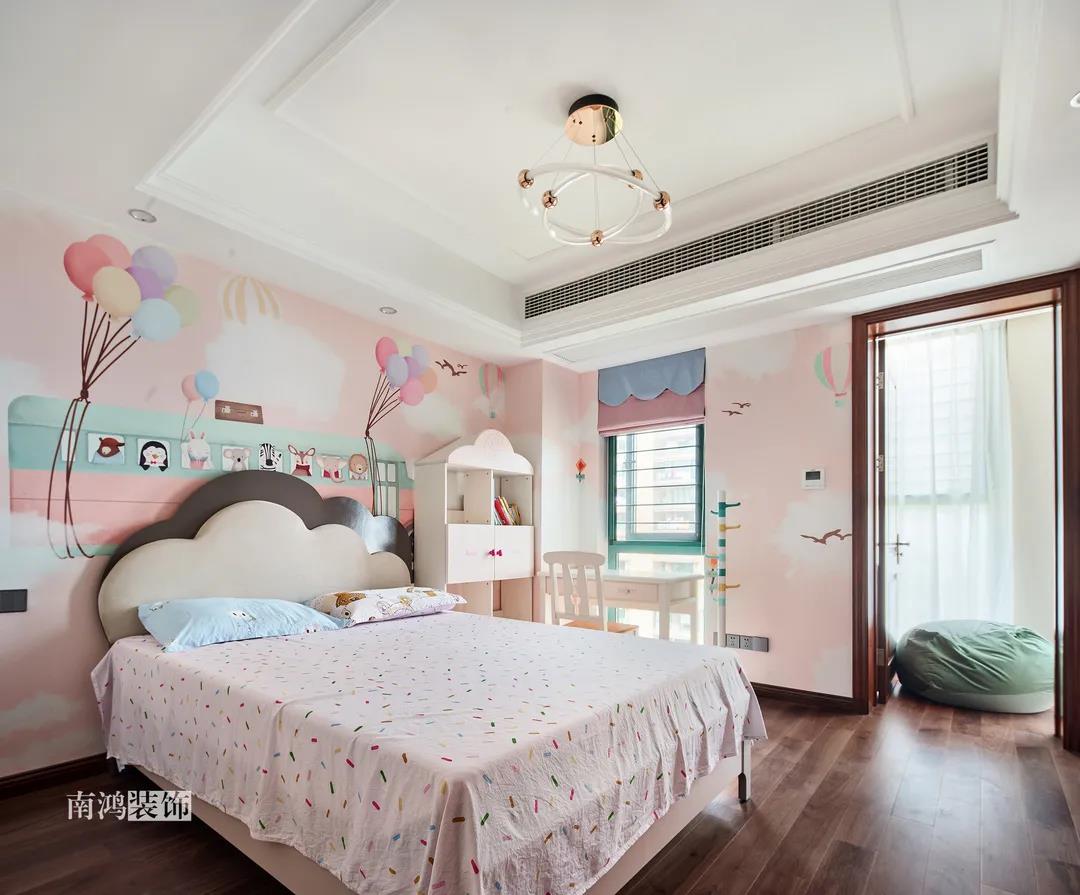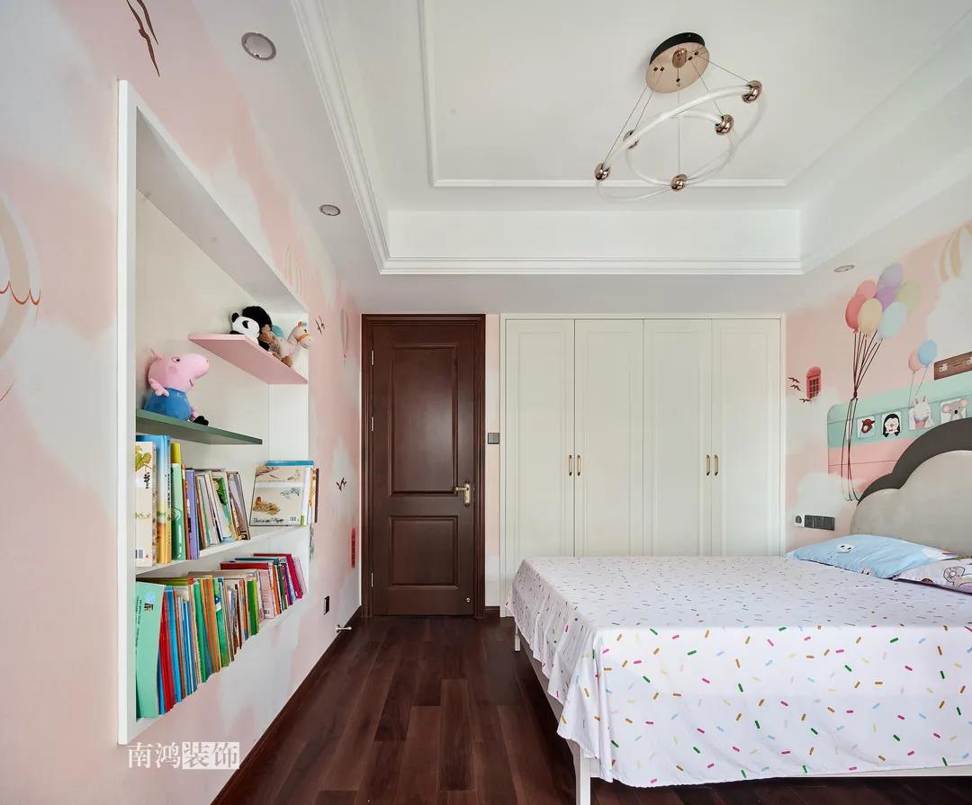 二樓兒童房。兒童房是孩子對色彩、形狀產生最初認知的地方,所以在設計上不僅要注重實用性,更要注重趣味性。童趣主題墻面、云朵狀的床頭、可愛的小掛衣桿,能讓小朋友在這里充分探索未知、創造快樂!